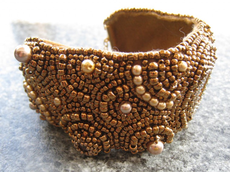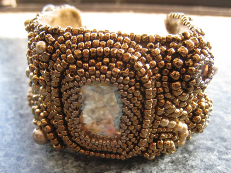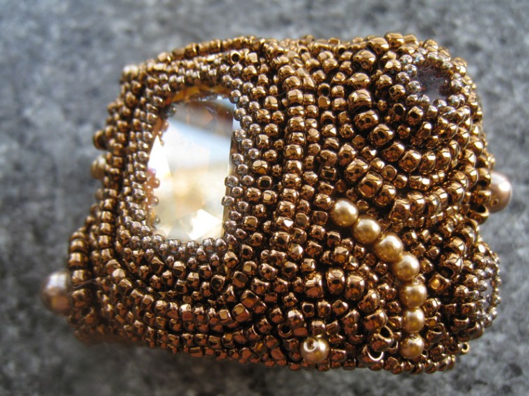 クリスタルと合わせて抑え目ながらもキラキラ感が出るように#221ブロンズ色のスリーカットビーズをメインに使用しています。